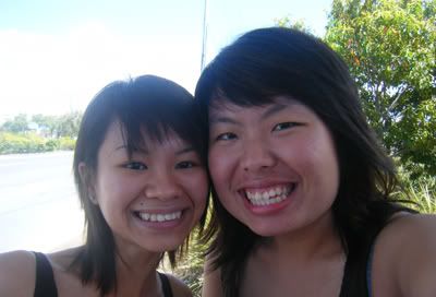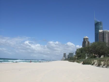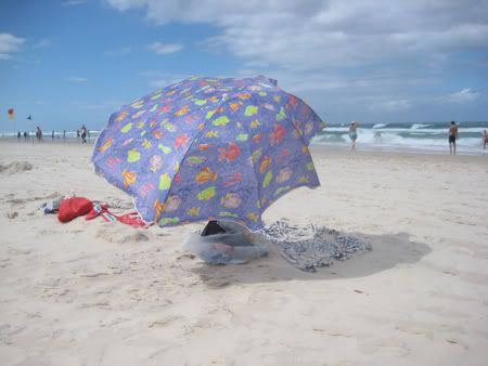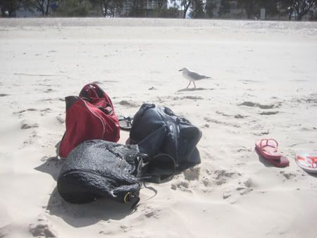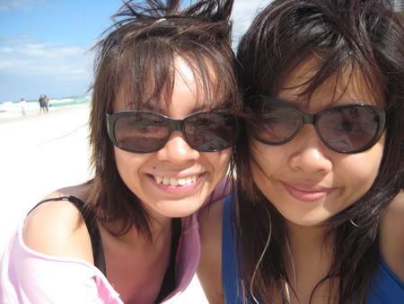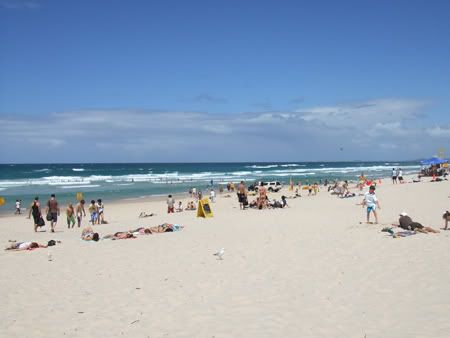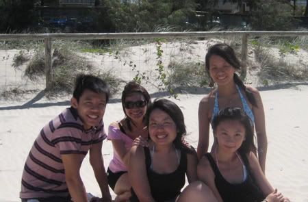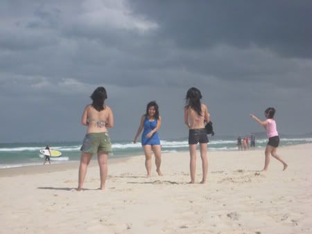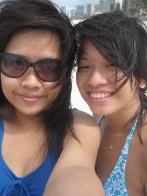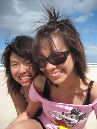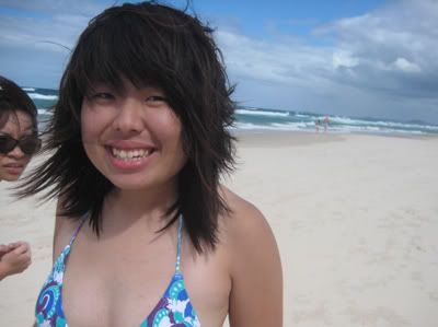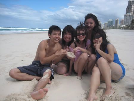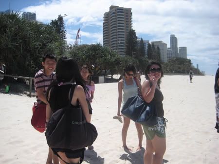 Then walk walk awhile.. went to change.. then off we go to the beach.. hehe.. strong wind!!! Damn cold.. gt sun.. but nt tt hot n strong eh.. haiya… walk walk.. found a spot.. put things down.. take pics.. hehe.. nua awhile.. then vanny, me, jiayi, mich went into the sea.. wah lao.. nw I noe y izzit called surfers paradise sia.. waves damn big n strong sia.. then we had to keep jumping n all to avoid the waves bringing us back to our starting pt.. hahaha.. damn funny.. fun but damn tiring!!! Kept being brought back to starting pt.. then drank a lot of sea water too.. my gosh.. play play.. damn tired.. sit down.. tann abit.. tok tok.. take pics.. agn.. hahaha. Then play play awhile..