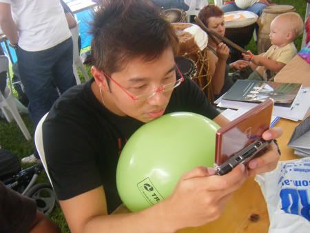 let Fabian play my ds.. everytime he sees me.. kept wanting to play.. but I nvr bring.. hahha.. so finally I brought.. hehe.. then wah.. he super addicted to it eh.. haha.. then tt time nvr buy his ds.. haiya.. he play play play.. dun care abt anything else.. till balloon can stuck to his chin.. oso dun care.. hahaha.. tok tok.. walk walk.. today lyk no business..