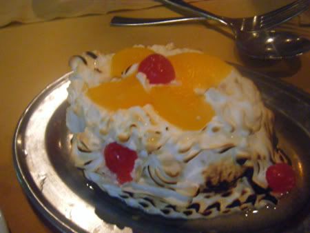 His cake.. flaming Alaskan something cake.. a lot of brandy sia at the bottom!!!!!!