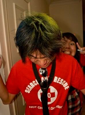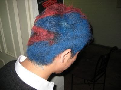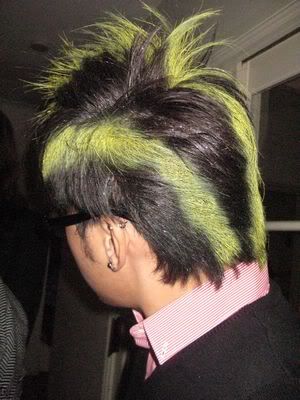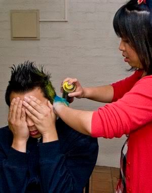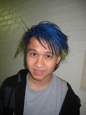 Then when pple started to come with wigs.. Dylan felt his hair like nt gd enough.. so make me spray the whole head.. whatever I want.. haha.. end product..